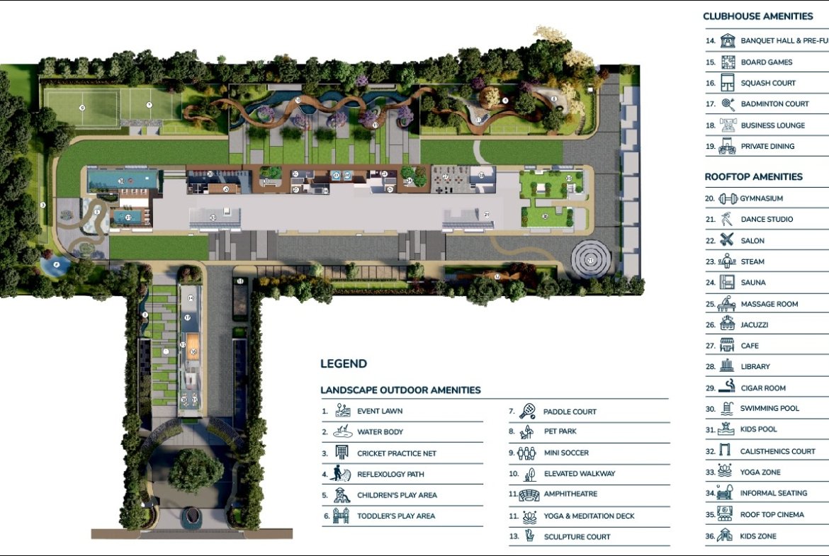 Spread across 5 acres, the project features 3 iconic towers rising 3B + Ground + 29 floors, housing 350 exclusive residences. Offering spacious 3.5 & 4.5 BHK apartments ranging from 2600 to 3000 sq. ft., each home is crafted for comfort, luxury, and timeless appeal.
