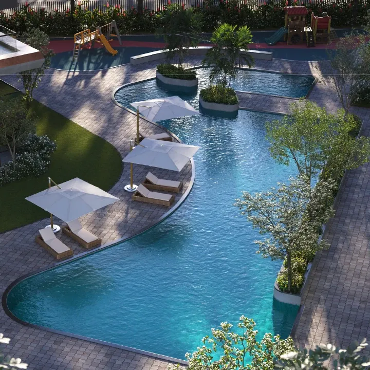 The people who live here can use a lot of things. There is an area that is just for sports and leisure, and it is 2 acres big. This area has a lot of world-class things, like a pool for kids and a garden for reflexology. There is also a fitness centre and places to play games inside. You can have parties on the lawn. There is a plaza by the pool. There is a hall that can be used for many different things.